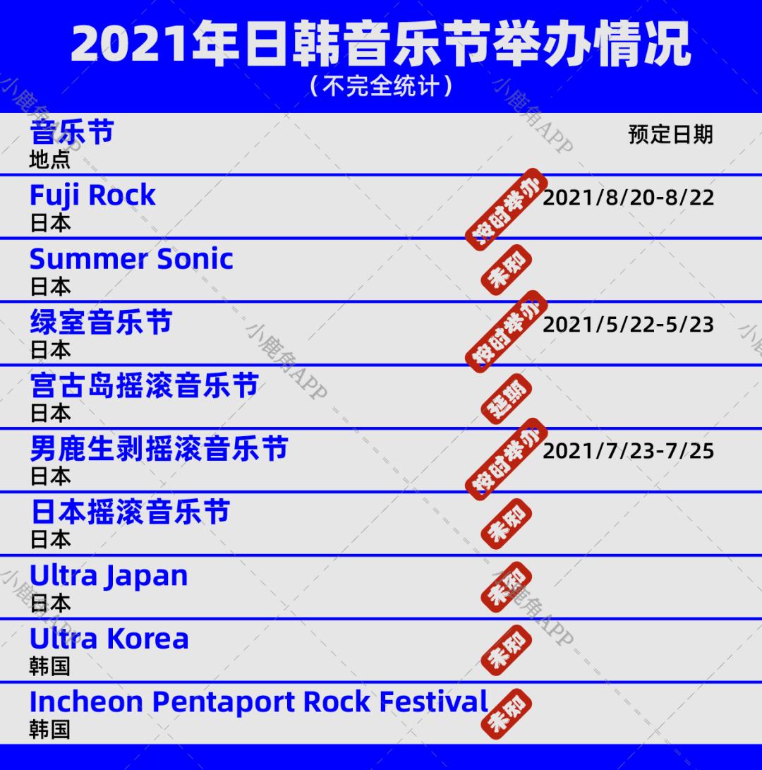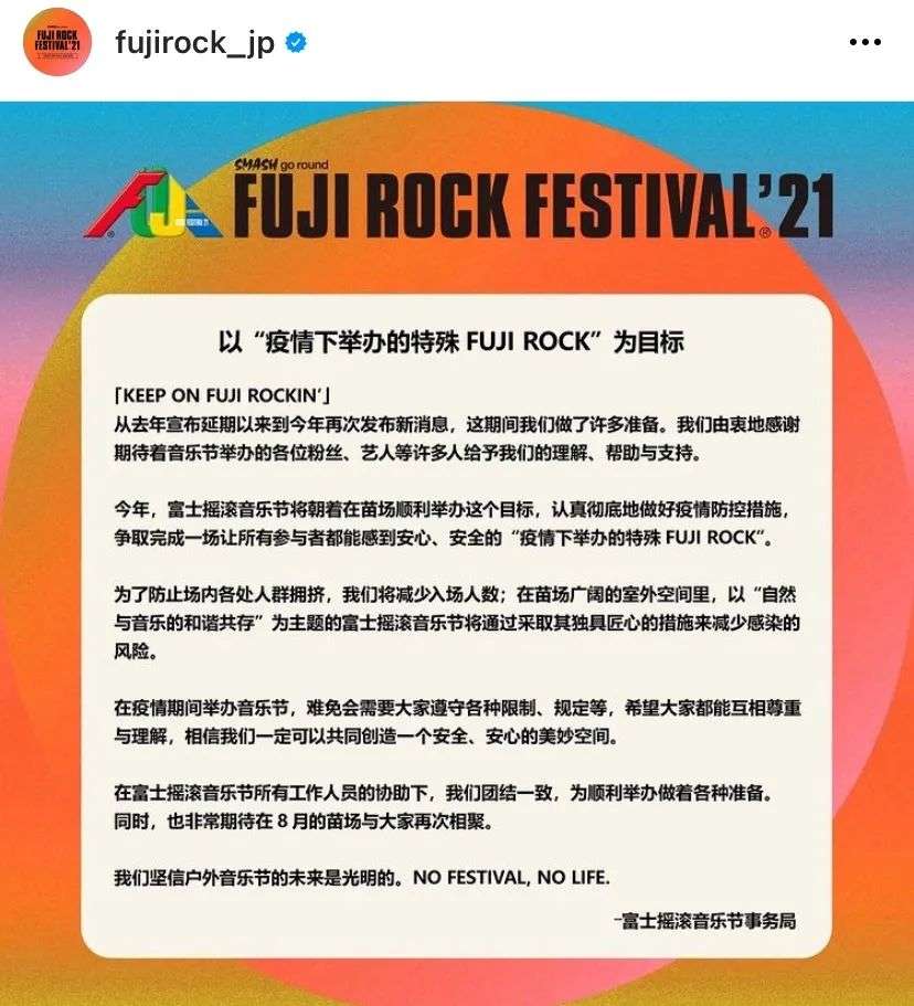3月26日,日本著名音乐节Fuji Rock主办方宣布将在今年8月份如期举办,并在声明中表示将“放弃邀请海外艺人”、“贯彻疫情防控指南减少观众人数”、以及“采取彻底的防控措施。” 同样宣布将在2021年举办的日本音乐节有5月底的绿室音乐节和7月底的男鹿生剥摇滚音乐节。