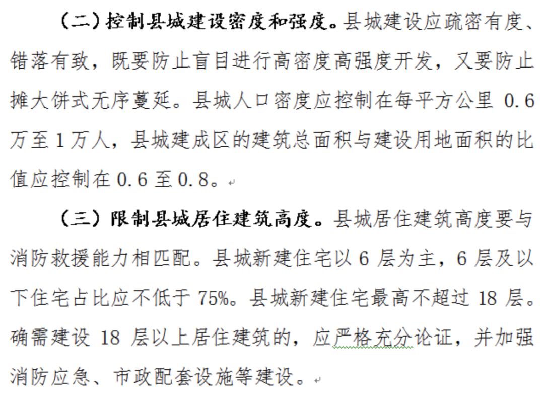 县城新建住宅多以6层为主,6层及以下住宅占比应不低于75%,县城新建住宅应不高于18层。