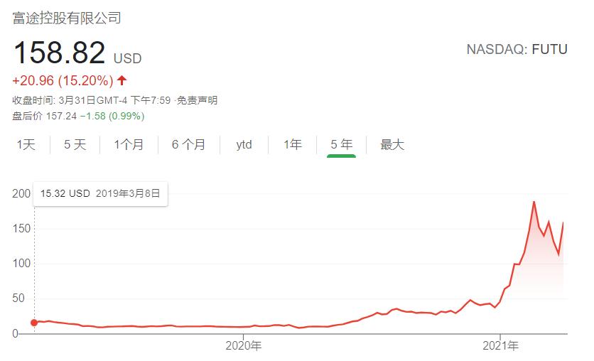 如果把时间拉得更长,在截至3月31日的过去一年,富途的股价从9.21美元,上涨至158.82美元,涨幅接近16.24倍,可以说是一只名副其实的十倍股。