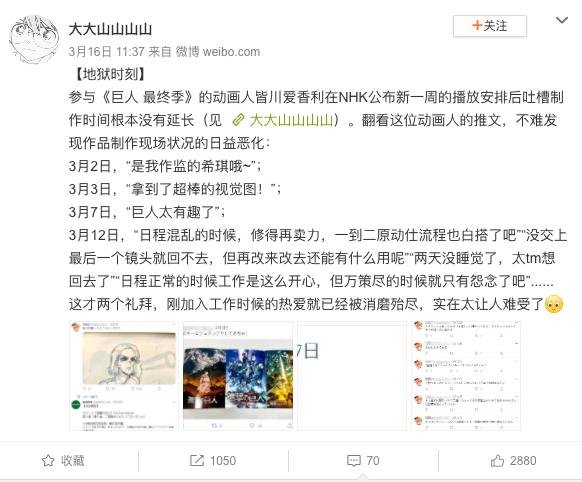 而如果说桥本敬史的抱怨,是MAPPA在沟通层面出现的失误,那么在《进击的巨人 最终季》的制作现场,则出现动画人反映工期紧张、工作压力过大的问题。
