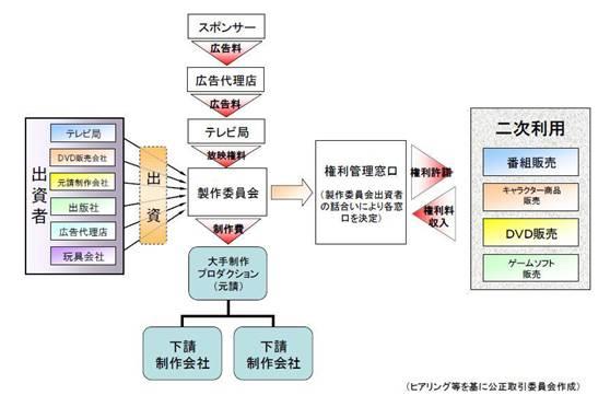 从90年代起,日本动画的制作多采取动画制作委员会制度。在此制度下,动画制片人牵头成立制作委员会。电视台、DVD/BD销售公司、广告代理商、衍生品厂商、出版社等等相关赞助商参与进来,约定出资比例并提供资金,最终由动画公司制成动画播出。