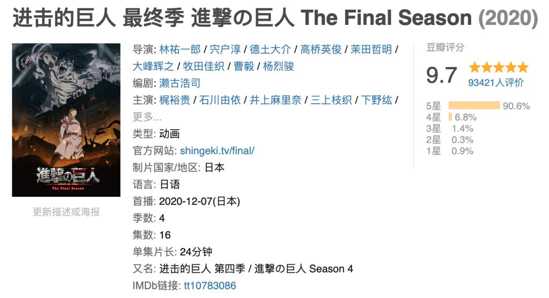 《进击的巨人 最终季》本身有着前几季留下的人气作为基础,再加上制作公司更换的风波(此前《进击的巨人》的动画均由Wit Studio制作),在开播前就成为了众人瞩目的焦点。好在不负期待,第一话播出后,超4000人在豆瓣上打出9.9惊人高分,以近乎满分的成绩开局。