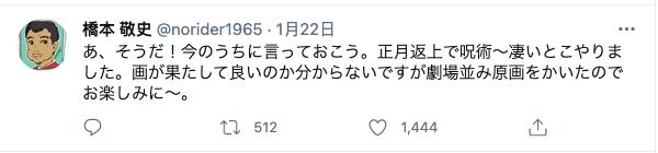 桥本在1月就预告,自己在《咒术回战》中画了剧场版等级的原画