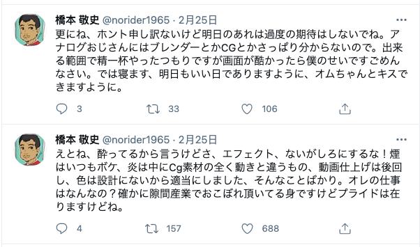 知名原画师桥本敬史在《咒术回战》第20话中负责了的重要作画部分,但在最终动画播出时,桥本的作画部分遭到修改,最终效果与桥本的预期差距很大。此举让桥本感觉到制作方对自己不尊重,连发数条推特表达了自己的不满。