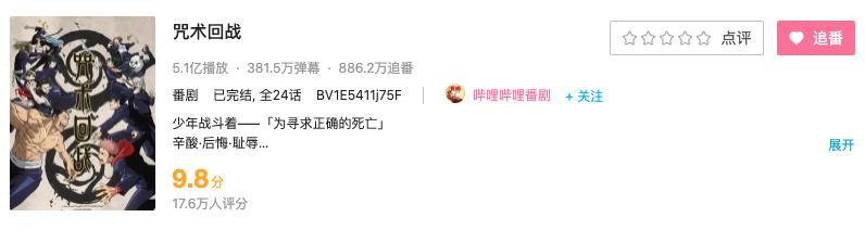而《咒术回战》作为一部JUMP系热血作品,凭借稳健的制作质量以及精彩的演出与作画,人气一路飙升,长期霸榜B站番剧排行榜,颇有与去年《鬼灭之刃》的人气一决高下的气势。