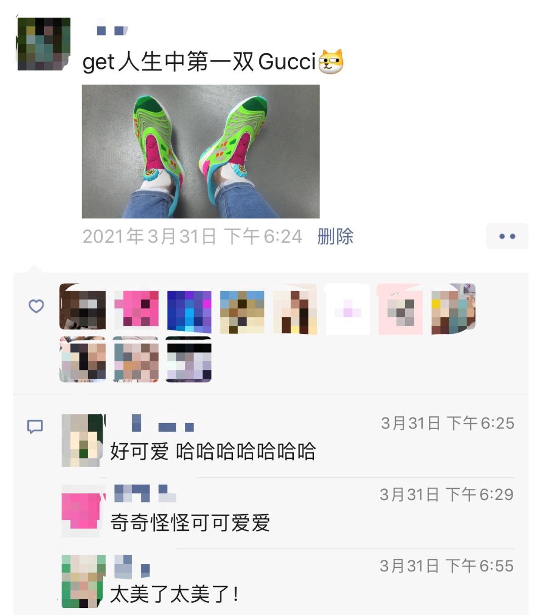 无论如何,咱也是有Gucci的人了。发一张朋友圈配文“get人生中第一双Gucci”,要不说奢侈品的社交货币是硬通货,竟然炸出不少从不点赞的高冷白富美和留学潮人们。