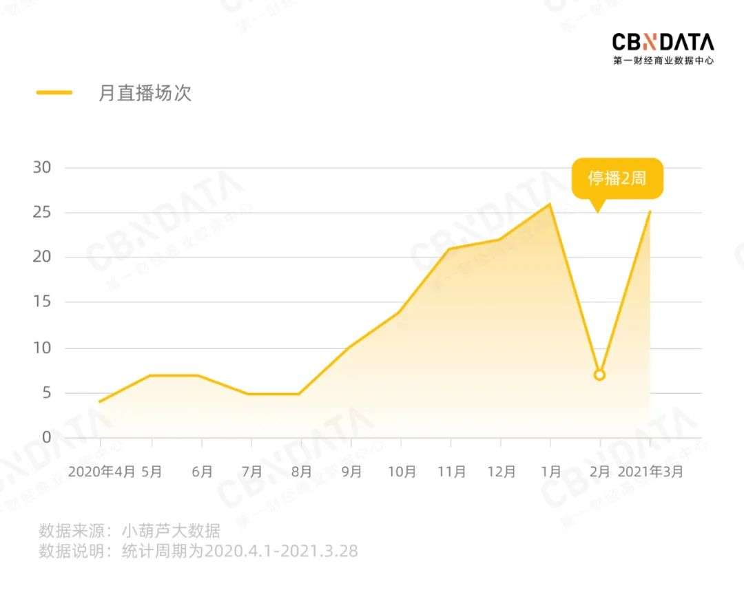 实现去年立下的日播flag,交个朋友花了约半年。从去年11月起,除了春节时期的短暂停播,交个朋友直播间每月开播场次均超过20场。