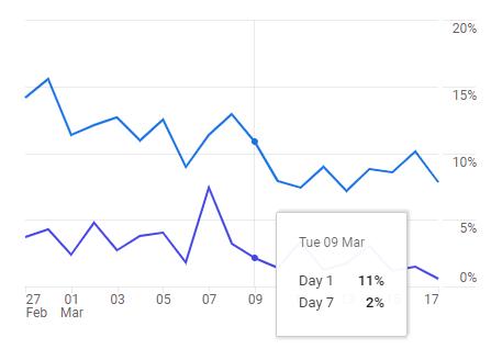 谷歌的官方说法更简洁,叫:Percentage of new users who return each day。