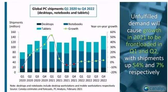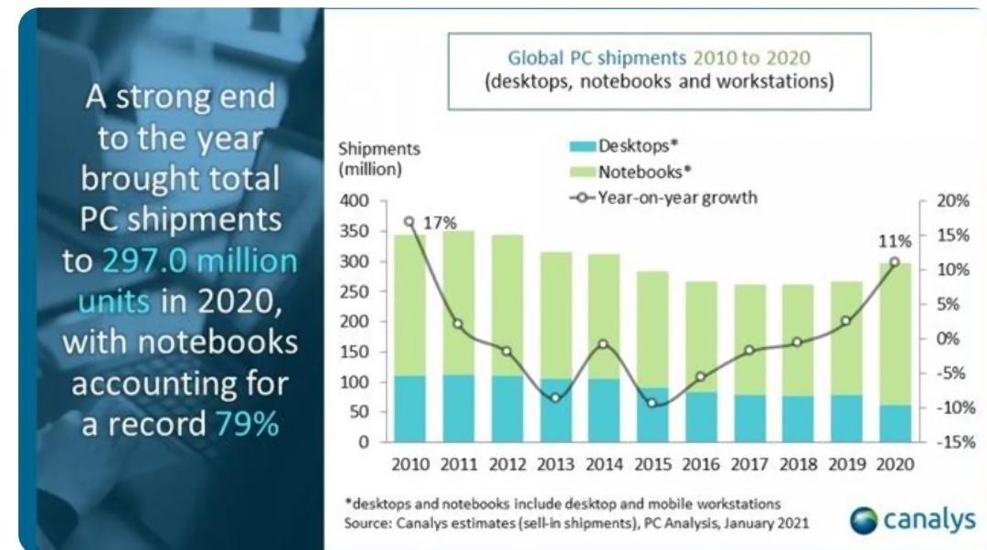 根据市场调查机构Canalys的数据,2019年,全球PC出货量止跌回涨,8年以来首次回暖。2020年,由于新冠疫情的影响,在家办公、居家网课的需求激增,全球PC出货量上涨11%,全年共售出2.97亿台电脑,其中笔记本电脑售出2.351亿台,占比接近80%。根据Canalys的预测,PC市场有望在2021年第一季度增长54%,并于未来三年内持续增长。