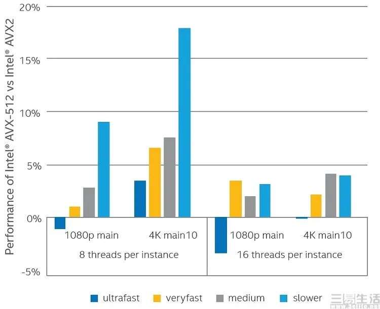 和256位的AVX2指令相比,AVX512指令也只在超重负载的4K视频编码里才快一点点