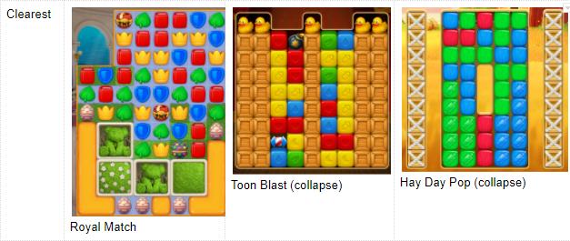团队看到的第一个痛点是,玩家玩久了三消手游,眼睛会有疲劳感。所以,「Royal Match」选了颜色鲜明的颜色、调整了形状大小,对玩家来说是更好区分的,不会给用户带来视觉疲惫感。另外,消除板的背景色和消除元素的对比度也很重要,一个小小的改变就能带给玩家很不同的体验。DoF 列出了 9 款不同的畅销三消游戏的消除面板,可以看出「Royal Match」的面板在清晰度上对玩家更友好。
