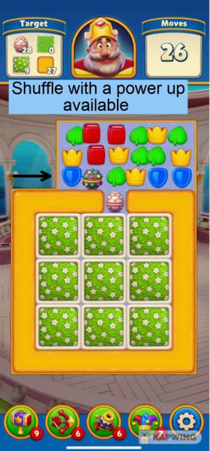 另外,在游戏体验上,「Royal Match」做了“死局”自动重启,为玩家提供更流畅的体验。玩家在玩三消游戏的过程中,经常会遇到出现“死局”,无法进行消除动作的情况。「Royal Match」会在出现“死局”的时候,由系统自动识别并为玩家免费重新洗牌,保证棋盘上是有元素可消的,让玩家可以不费任何精力把游戏进行下去。且消除面板右下方有洗牌(Shuffle)道具,玩家也可以使用洗牌道具来进改变“死局”,这不会浪费玩家的步数,且不会与其他消除道具冲突。