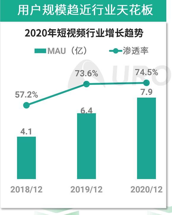长短视频领域的僵持为中视频创造了条件。根据极光的数据显示,2020年,短视频行业渗透率和MAU均稳中有升,截至12月份,分别为74.5%和7.9亿,用户规模趋近短视频行业天花板;而在线视频已进入存量市场,用户群体进一步分流,用户渗透率趋势2020年稳中略降,12月渗透率为74.5%,MAU一年间基本保持稳定。