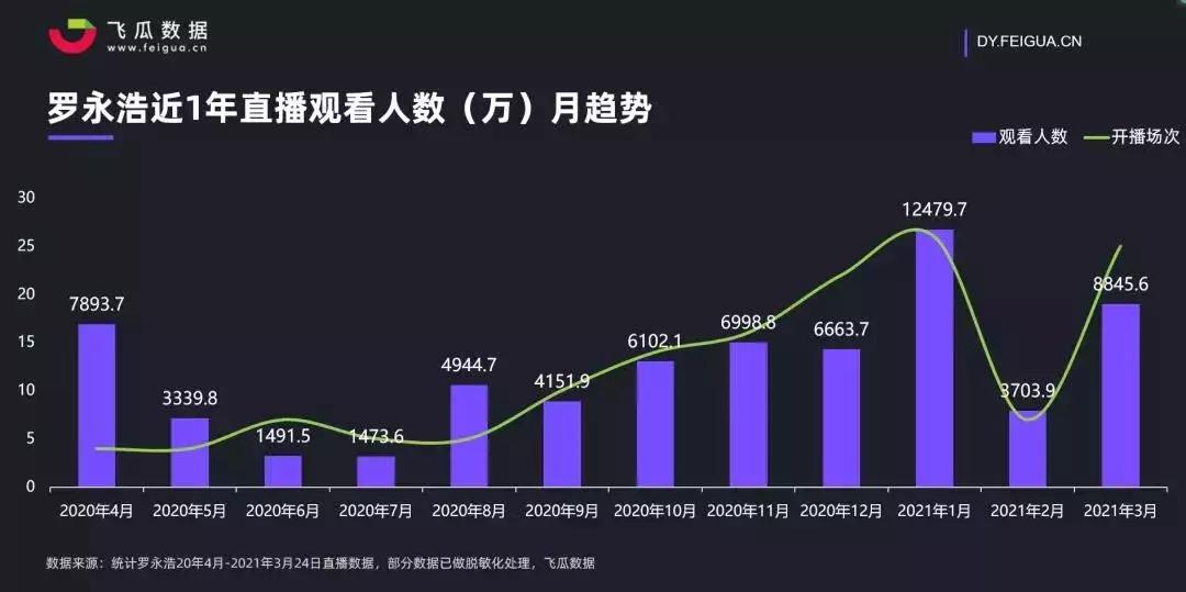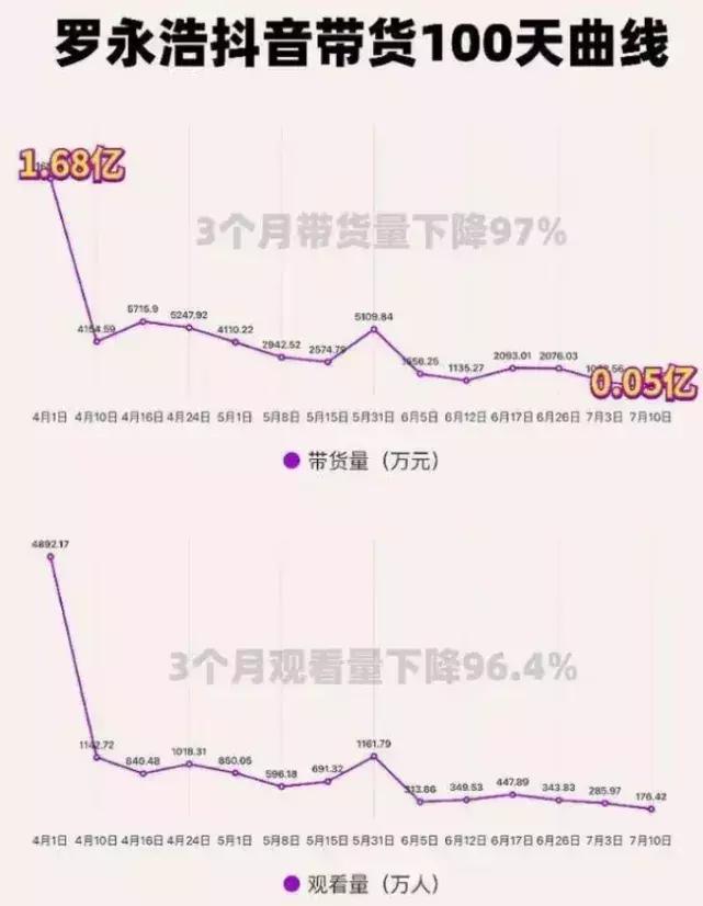首次开播的4月,罗永浩直播间的观看人数累计达7893.7万,到了5月就减少了一大半,只有3339.8万人,6月再减少一大半,只有1491.5万人。