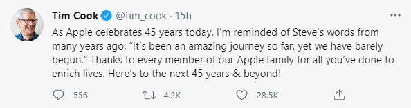 而昨天,正是苹果公司成立的第 45 周年,苹果现任 CEO 蒂姆·库克也发推纪念这天: