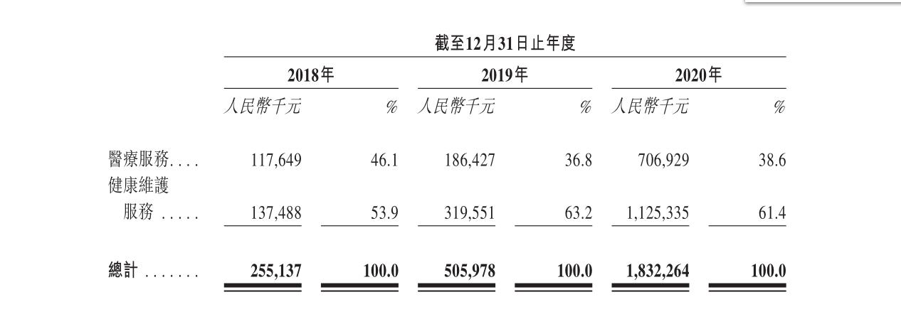 具体来看,微医的营收主要来自两大板块,包括医疗服务和健康维护服务。前者即线上+线下闭环的诊疗及咨询服务,包含提供在线预约、线下首诊、病历共享、在线复诊、电子处方、在线支付等服务;后者则是会员式数字化慢病管理、“流动医院”等服务。招股书披露,这两大业务在2020年的营收占比分别为38.6%、61.4%。