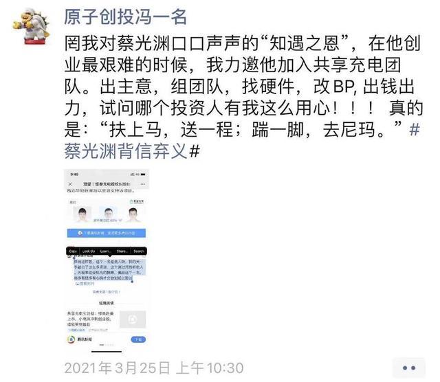 冯一名认为自己看到共享充电宝的风口,于是物色CEO、组团队、找融资、建供应链。但怪兽CEO蔡光渊微信中承诺的3%股份赠予一直没有落实。气不过的冯一名认为蔡光渊成功后,对自己是“踹一脚,去尼玛”。