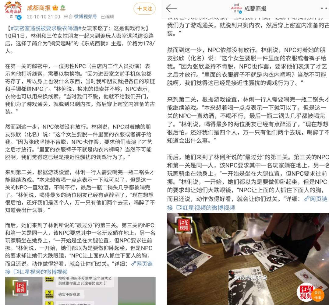 2020年10月,成都商报也曾报道,在成都的一家密室中有男性NPC要求女玩家脱下贴身的衣服,对女玩家劝酒,让女玩家做具有色情意味的动作等等。