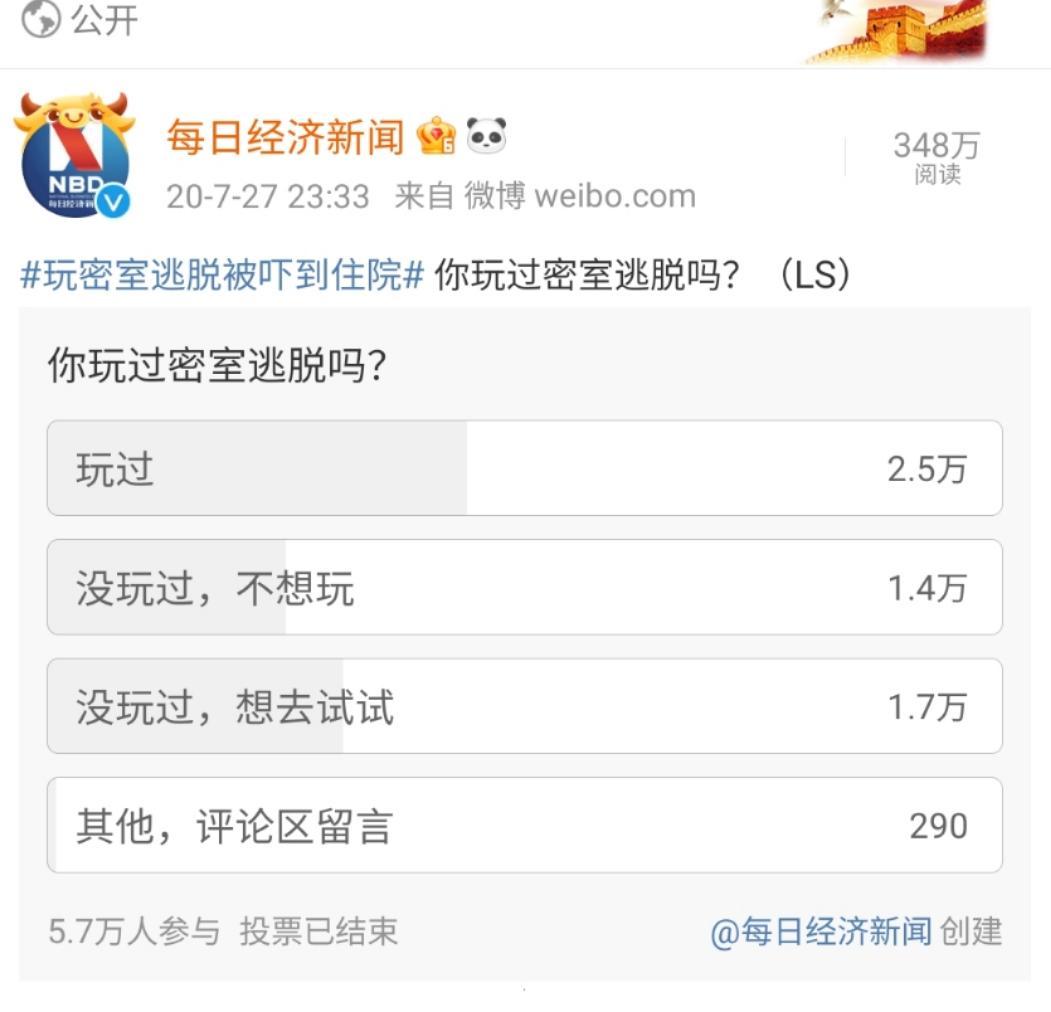 除了看综艺,人们对于去线下亲自体验一把密室的刺激也从不吝啬。每日经济新闻就曾在微博上发起过一次投票,在参与投票的5.7万人当中,玩过密室逃脱的人就占到43.85%;想要去玩儿的人也占到29.82%。