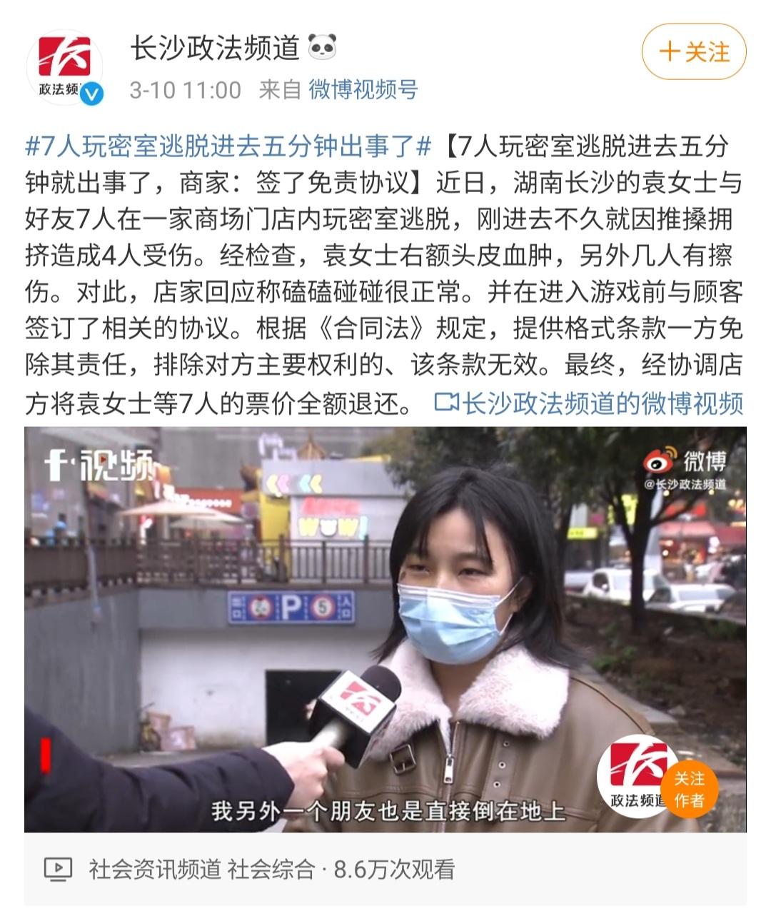 3月10日,长沙政法频道就报道,有玩家在密室中因推搡拥挤而被撞得头破血流,但店家却以磕碰正常、玩家提前签了免责协议(这种协议在合同法中无效)为由不愿意承担责任。