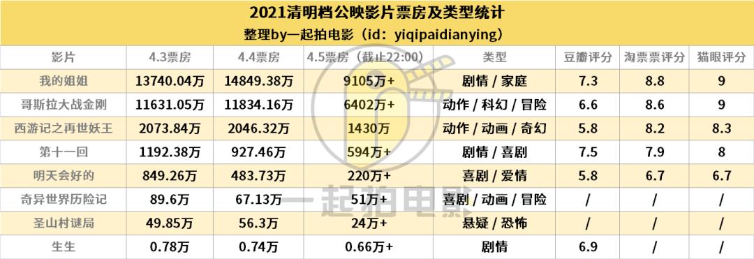 此外,档期内“贫富不均”的现象正变得愈发严重。2019年清明档前三分别是《反贪风暴4》2.67亿、《雷霆沙赞!》1.99亿,以及《调音师》7195万;而今年的前三名则是《我的姐姐》3.76亿、《哥斯拉大战金刚》2.98亿,《西游记之再世妖王》5512万。影片之间的差距正不断拉大。