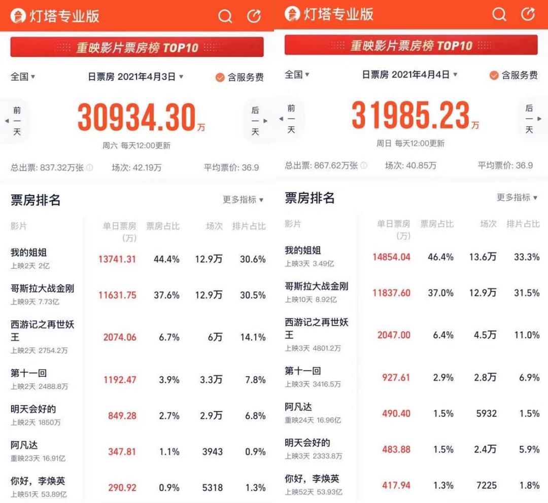 目前,清明档只有《哥斯拉大战金刚》一部进口片“一枝独秀”,3号、4号连续两天在排片为30%多的情况下,均贡献了超过37%的票房占比。而整个清明档,本片和《我的姐姐》一共占据了超过60%的排片比,某种程度上来看,清明档大盘也是靠这两部影片带动起来的。