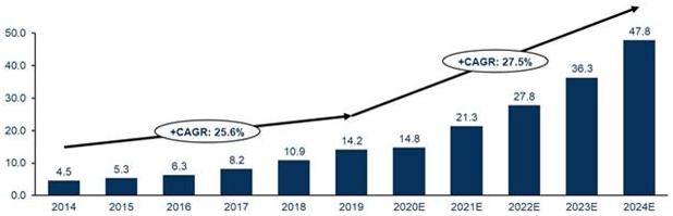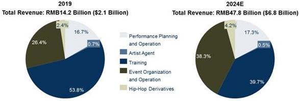 根据弗若斯特沙利文报告(Frost&Sullivan Report)显示,嘻哈文化市场发展迅速,其市场总量也在不断增长:收入从2014年的人民币45亿元(约合7亿美元)增至2019年的人民币142亿元(约合21亿美元),复合年增长率(CAGR)为25.6%。并预测2024年总收入增至478亿元人民币(68亿美元),2019年至2024年的整体复合年增长率为27.5%。