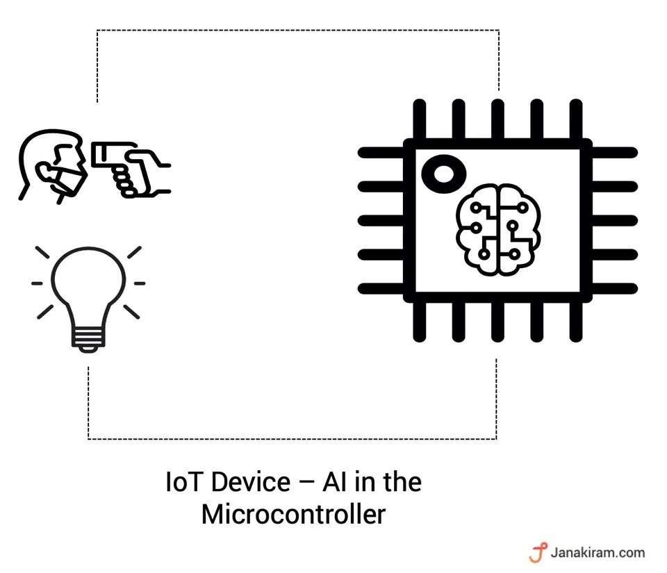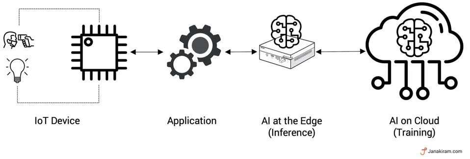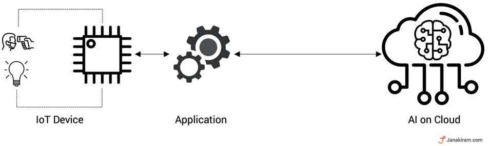 开发人员和数据科学家利用高端CPU和GPU训练模型,然后托管它们以进行推理。每个消耗AI的应用程序都与云对话。该应用程序将与微控制器通信以管理传感器和执行器。