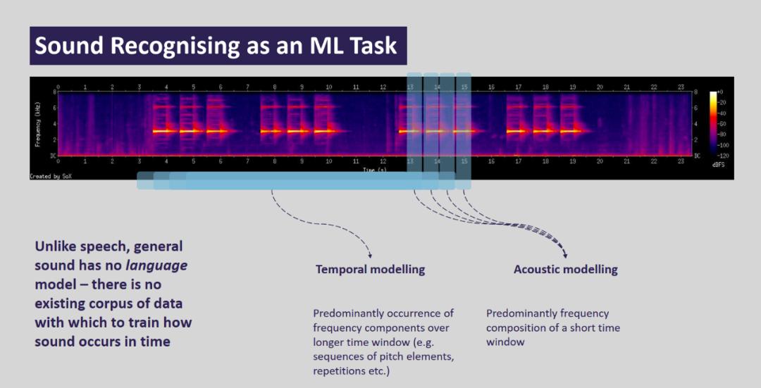 还有很多声音,比如机床震动的声音、车辆抛锚的声音、报警器鸣响的声音…这些声音不同于语音,没有语言模型。