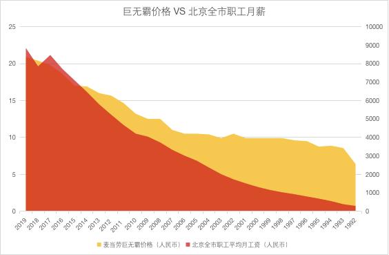 麦当劳 1992 年刚进入北京时,巨无霸的售价是 6.4 元,炸鸡块的售价是 10 元。而当时北京电器市场招高级工,月薪才 300 元,还不包吃住。根据官方的数据,当年北京市职工年平均工资为 3402 元,每月月薪还不到 300 元[2]。也就是说,当时的北京市民每月的收入还不够吃 15 次麦当劳。这一价格,已经接近当年北京的高端西餐厅“老莫”。