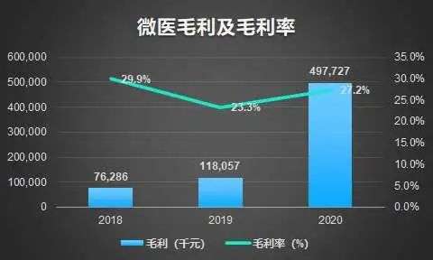 2018年—2020年,微医的毛利分别为7629万元、1.18亿元和4.98亿元。毛利率分别为29.9%、23.3%和27.2%,总体来看, 毛利率出现一定程度的下滑。