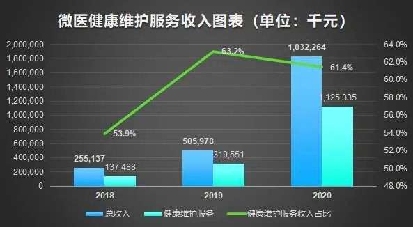 招股书数据显示,2018—2020年,微医健康维护服务收入分别为1.37亿元、3.20亿元和11.25亿元,在当期营收占的占比分别为53.9%、63.2%和61.4%。