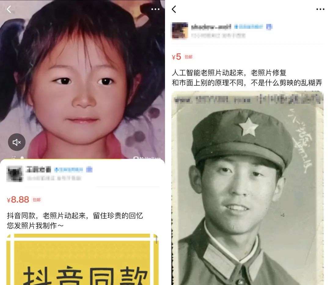 但如今,在闲鱼等平台上,虽然用“照片活化”等关键词搜不到相关内容,但是,商家大多打着让老照片动起来的幌子在兜售照片活化工具,花5-8元就能让一张照片动起来。