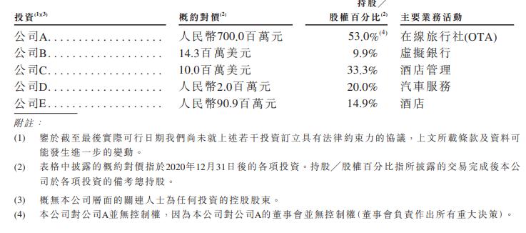 自2020年底至最后实际可行日期,携程已对(或拟对)多家公司进行投资,截至最后实际可行日期(2021年3月31日)的投资领域包括OTA、虚拟银行、酒店管理、汽车服务和酒店。