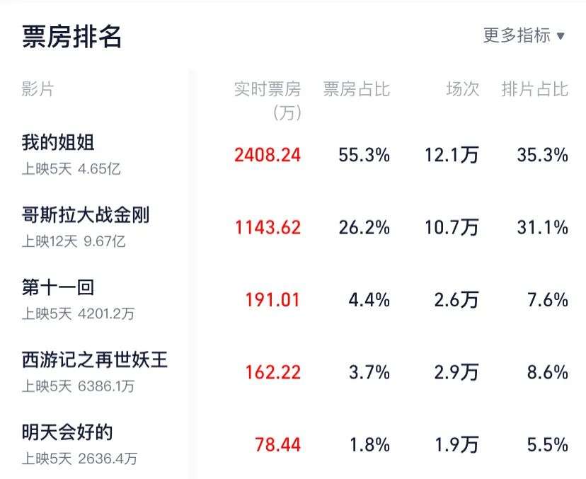 三天的8.2亿里,票房冠军影票《我的姐姐》贡献了3.78亿,占比高达46%;排名第二的《哥斯拉大战金刚》2.99亿,占比为36.4%,两部影片就拿下了档期82.4%的票房;季军影片《西游记之再世妖王》和第四名《第十一回》也都属于国产影片。在前四部影片中,有两部国产亲情片。