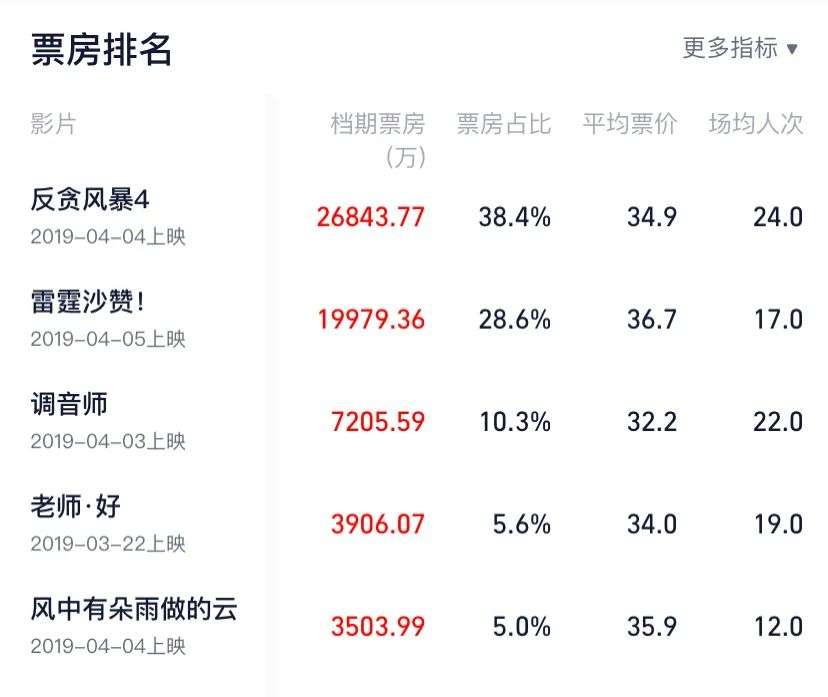 灯塔专业版数据显示,2019年清明档的6.98亿里,票房冠军是国产电影《反贪风暴4》,但档期票房只有2.68亿,占比38.4%,亚军是进口片《雷霆沙赞!》,票房2亿,占比为28.6%,季军也是外片《调音师》,票房7205万。