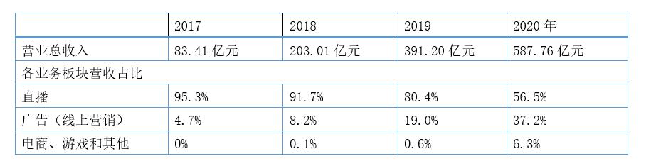2017-2020快手营收情况及各业务板块对营收的贡献来源:数据来自快手招股书及2020年业绩公告,作者绘制