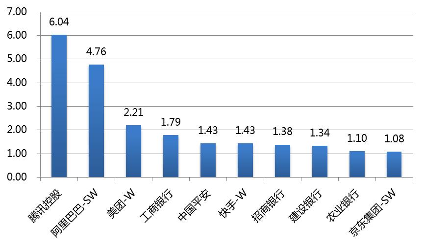 2021年2月17日股价计港股市值前10 的上市公司情况(单位:万亿人民币) 来源:Wind数据,作者绘制