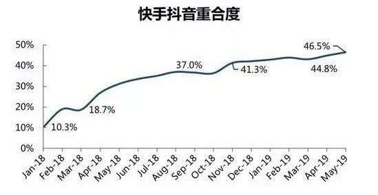 2018年1月-2019年5月间快手抖音用户重合度变化情况来源:转引自英尼网络