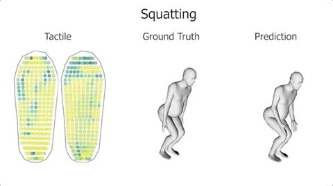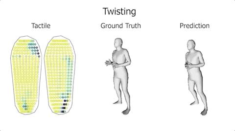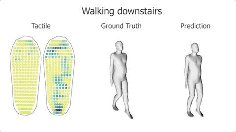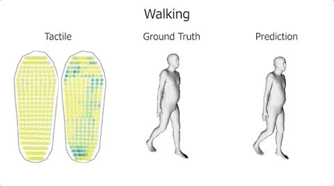 利用机器学习,将人体姿势、与触觉脚印关联起来,从而预测人体的运动。