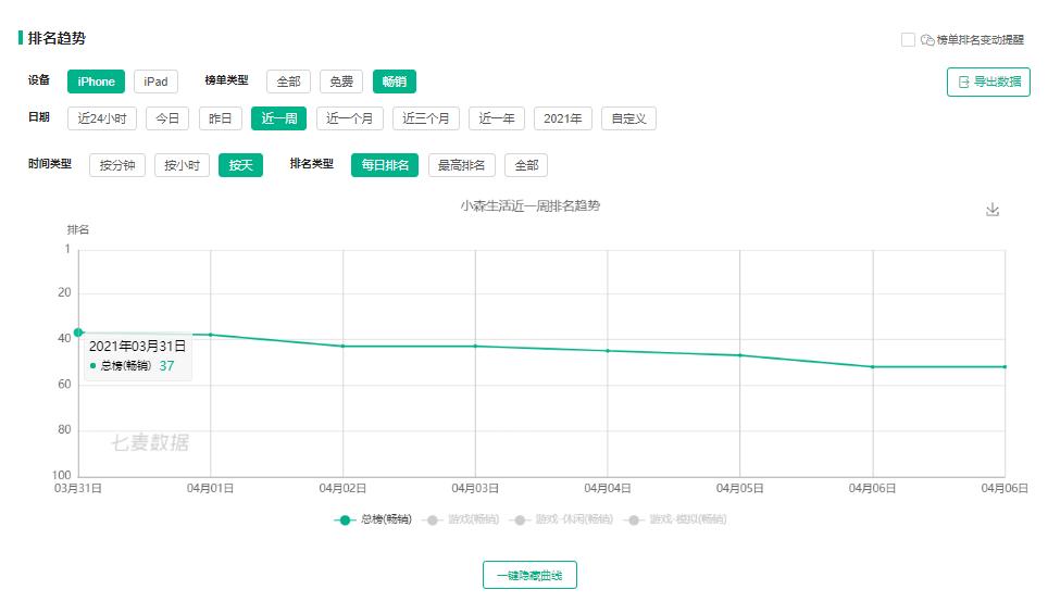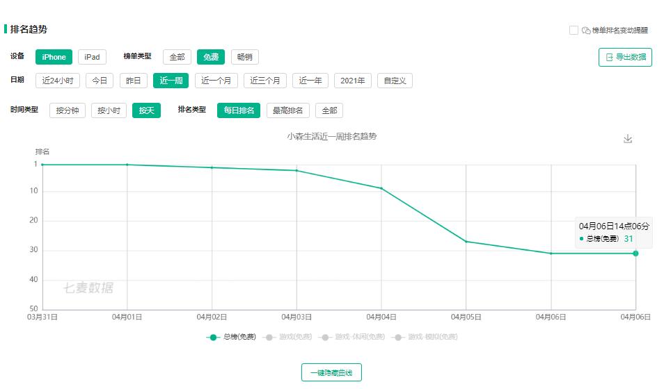 七麦数据显示该游戏的下载量从4月2日后大幅下滑,上线6天IOS端仅有200万下载量,刚刚过去的清明小长假本来应该是游戏高峰期,结果却加剧了《小森生活》的新增玩家流失。