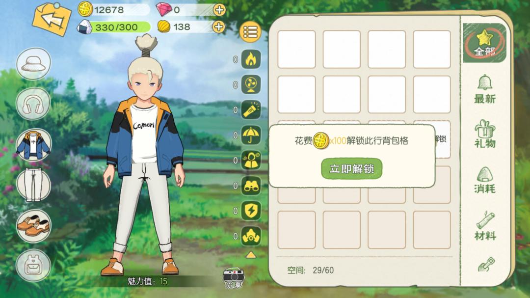 作为“田园打工人”,你的背包只有60格的容量,道具分类并不友好,很容易堆满,想扩容背包需要金币解锁。初级工具砍树每次费2点疲劳,一棵树需要砍3次。高级工具只要砍2次,每次1点疲劳。而睡觉并不会回满疲劳度,只能回复一部分,随着游戏时长增加玩家会逐渐发现需要付费回复人物的疲劳度。