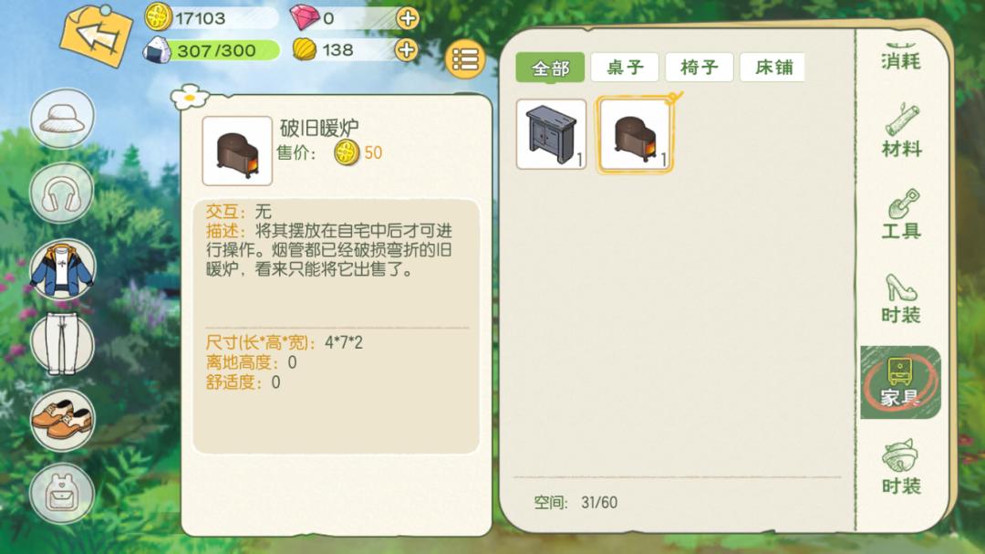 游戏中玩家可以建造自己的屋子,但家具摆放十分麻烦,玩家需要先从【背包】下拉到【家具栏】,再选择家具进行放置,摆放的时候无法直接拖动家具,只能通过移动人物和虚拟按键调整位置,在很多游戏里常见的家具界面,这款游戏里竟然没有。