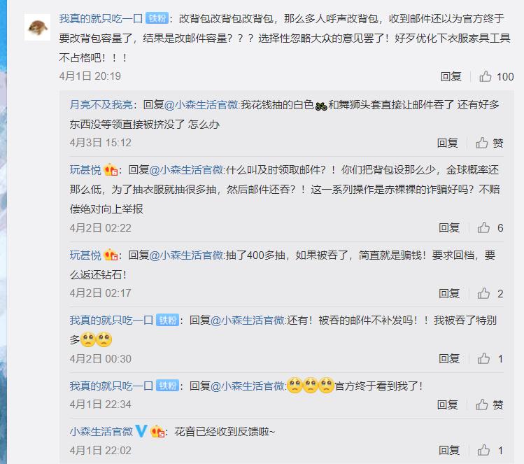 《小森生活》还有很多令人哭笑不得的设定,游戏中邮件系统上限是60封,到达上限时新邮件会自动替掉旧邮件,而且不会提醒玩家。不少玩家自己充值获得的珍稀道具就这么不明不白的消失了。在微博投诉后官方仅仅回复“收到反馈啦~”,并没有给玩家补发因bug丢失的物品。