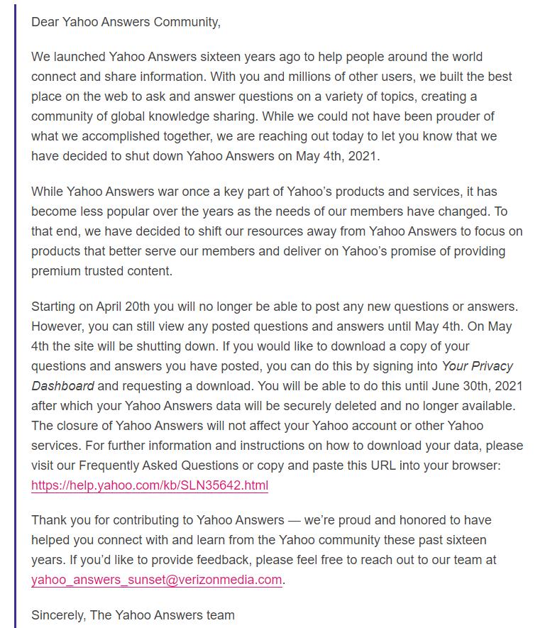 不过,根据雅虎问答官方发给雅虎用户的一封信中,我们也得到了一个关闭雅虎问答的主要原因,信中详细地说明了为何雅虎要关闭问答平台,并表示“随着用户需求的变化,它(雅虎问答)已经变得不那么受欢迎了。”“公司决定将资源转移到其他能更好地服务好会员的产品上,并兑现雅虎提供优质可信内容的承诺。”