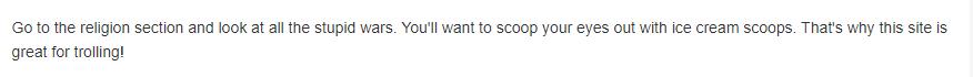 另一位匿名网友表示:“去宗教区看看那些愚蠢的战争。你会想用冰淇淋勺把眼睛挖出来。这就是为什么这个网站是伟大的喷子!”