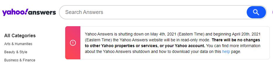 据外媒消息,Yahoo!(下文统称:雅虎)旗下最大的问答社区“Yahoo!Answers”(雅虎问答)将于5月4日永久关闭。雅虎问答主页也发布了相关公告: