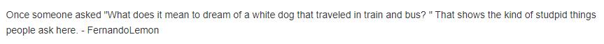 而在问题质量上,也出现了让用户越来越不满意的现象。网友@FernandoLemon:“曾经有人问 ‘ 梦见一只白色的狗乘火车和公共汽车旅行是什么意思?’ 这说明这里的人问的都是些什么蠢问题”
