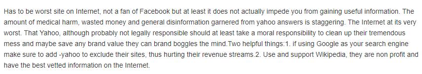 举个例子,问答社区的出发点是单纯严谨的知识分享,但拥有了大量用户的雅虎问答在内容严谨度的把控上或许也是“不够严谨”。有网友表示:“由雅虎问答造成的医疗伤害、金钱浪费和虚假信息事件的数量非常惊人”、“雅虎可能没有法律责任,但至少应该承担起道德责任”。
