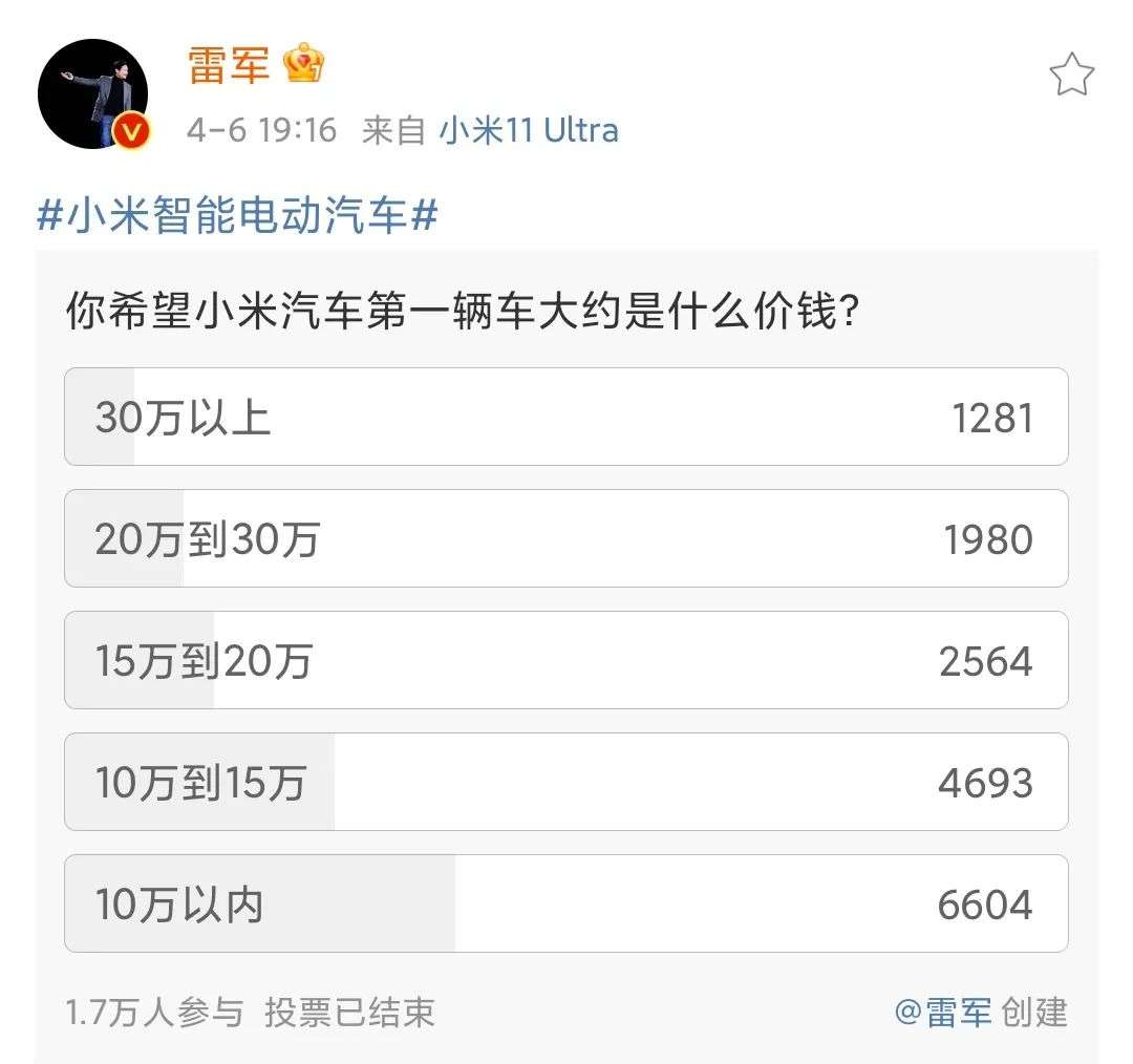 雷军发起小米汽车价格区间投票,截图自雷军个人微博